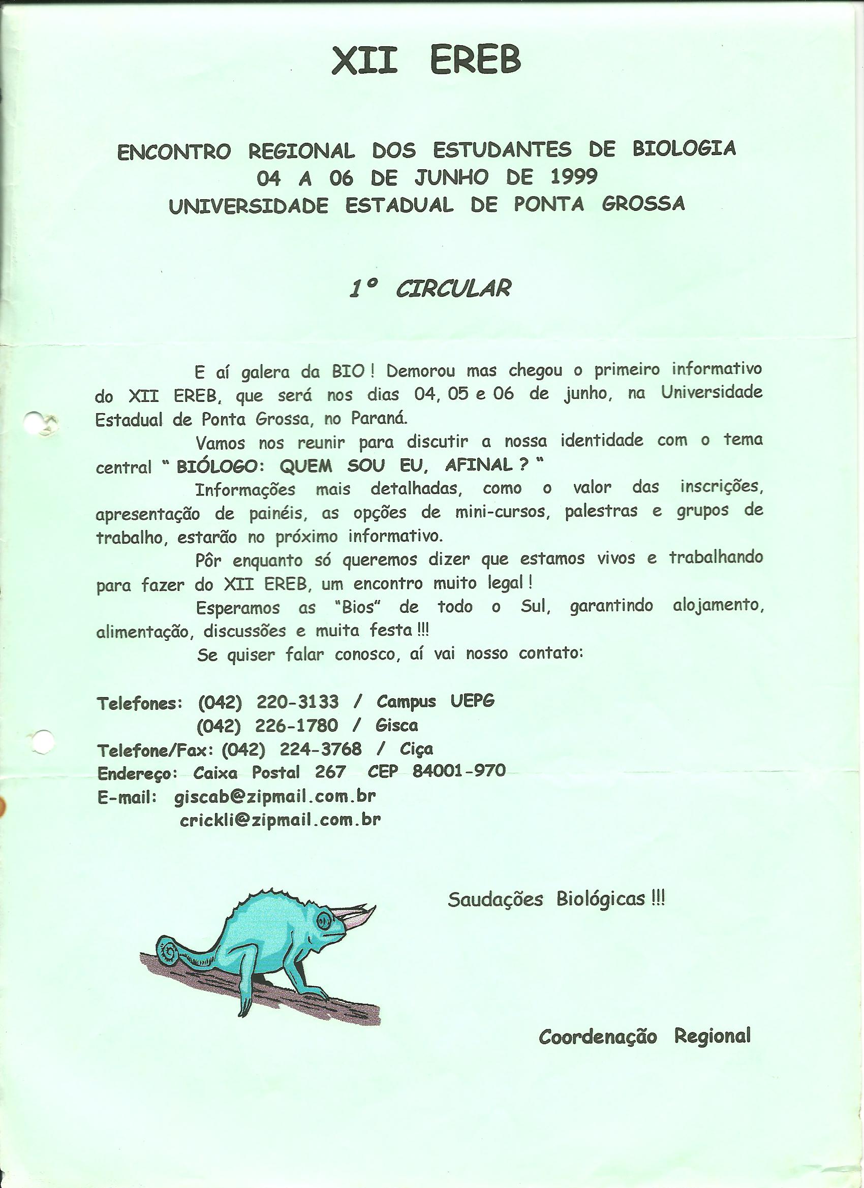 1999: No EREB-Sul anterior fica decidido que a UEPG, de Ponta Grossa, PR, organizaria o XII EREB. Há dois informes sobre o encontro, mas por enquanto não encontramos confirmação se ocorreu ou não.