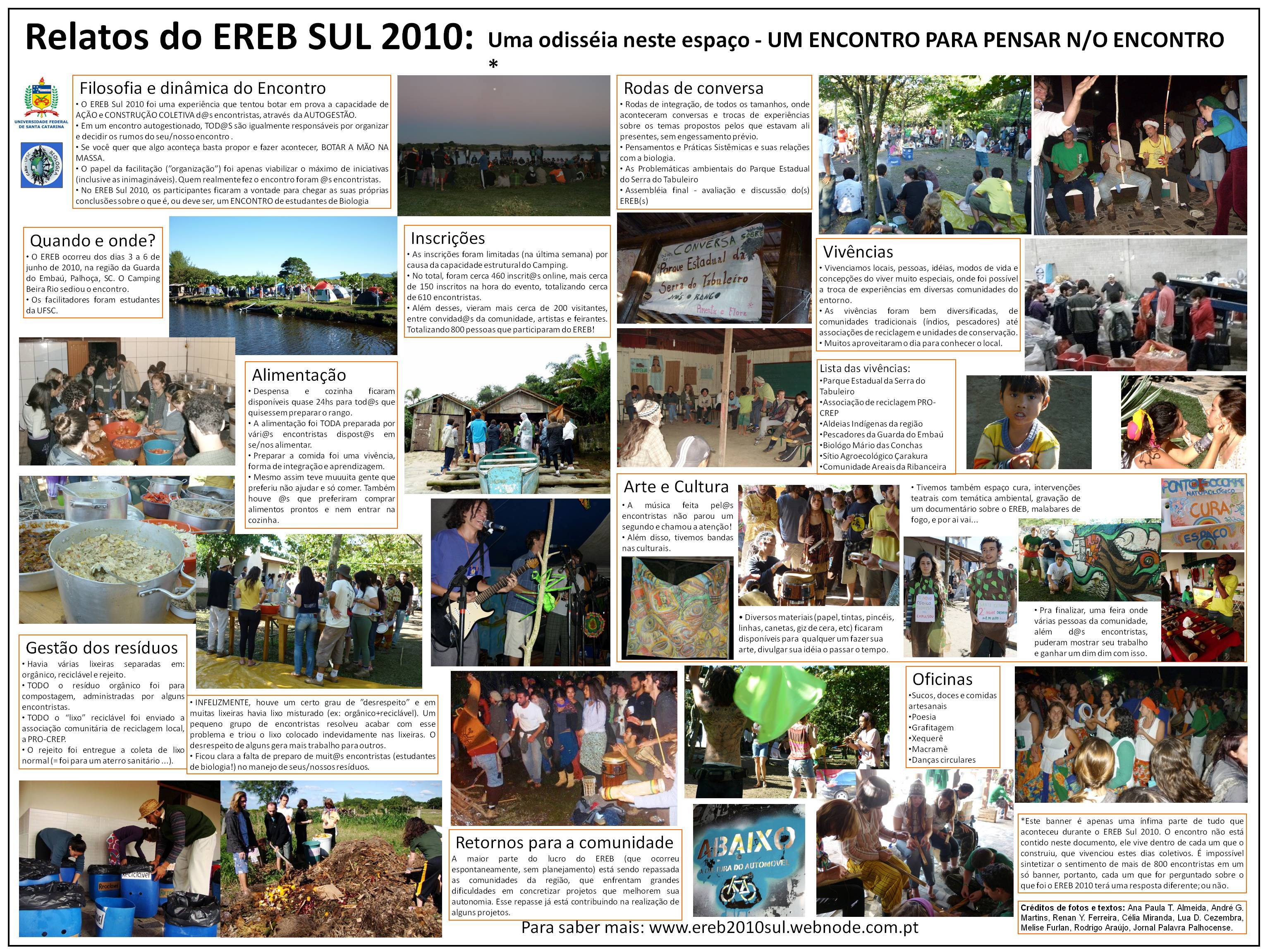 Em 2010, o EREB-Sul ocorre na vila da Guarda do Embaú, em Palhoça, SC. É preparado por estudantes da UFSC e dá continuidade ao desenvolvimento da autogestão nos EREB-Sul, reunindo cerca de 610 encontristas numa dinâmica em que todos estavam responsáveis e livres para organizar os espaços vitais do encontro. Na prática, a dinâmica funcionou, mesmo que não tenha conseguido incorporar a maioria dos estudantes nas atividades de organização, talvez pela falta de informação ou consciência desses encontristas. Entre outras atividades, no Encontro são realizadas sete vivências (incluindo aldeias Guarani, sítio agroecológico e associação de reciclagem), duas palestras, quatro oficinas, uma feira aberta a comunidade, além de dezenas (ou seriam centenas?) de manifestações artísticas, com duas intervenções teatrais e muitas grandes rodas de música.